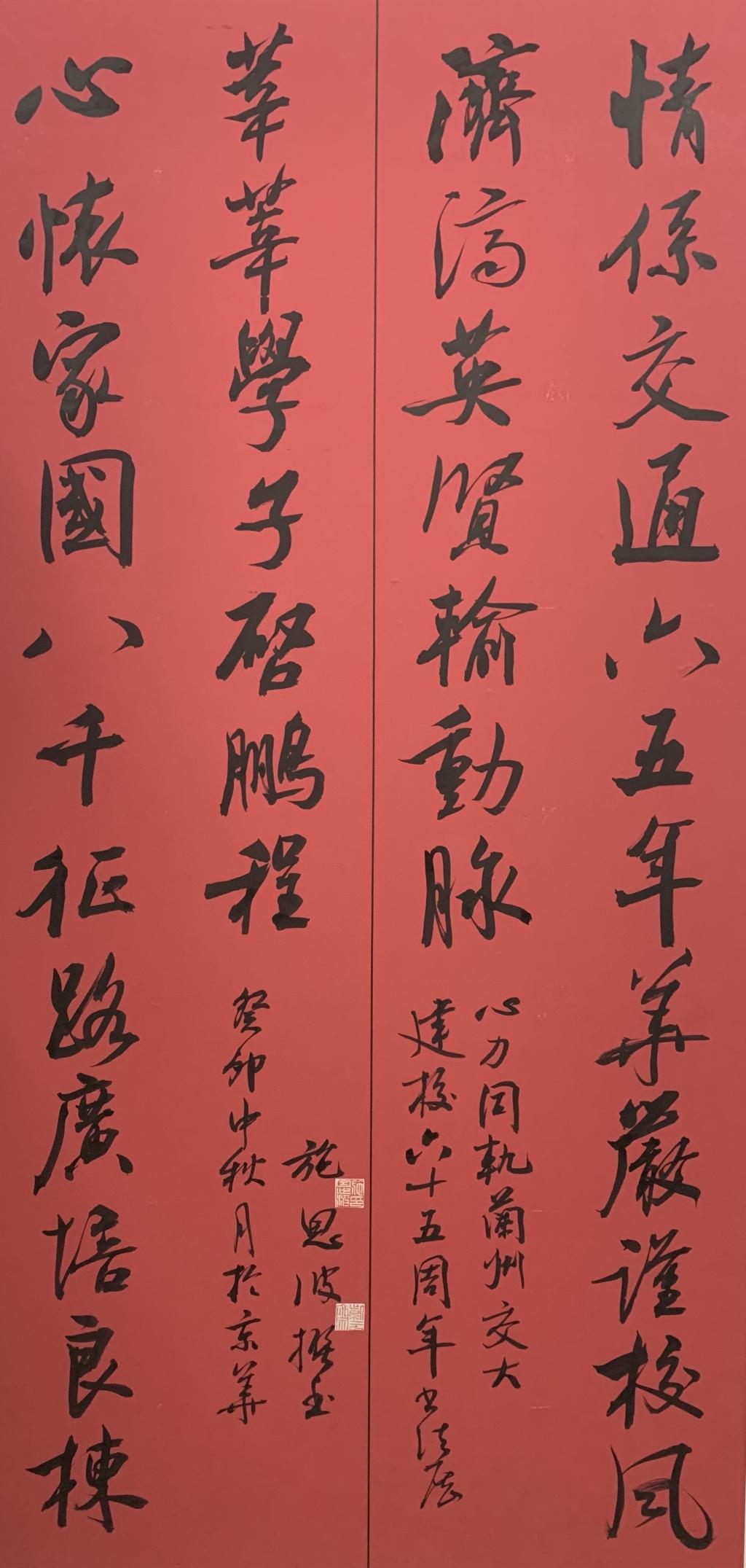 作品书写内容主题突出、风格多样,旧雨新知抚今追昔,点画间畅抒胸臆,自豪之情、祝福之意款款表露;每一件作品都真切体现了他们对时代美的无限追求、对艺术的执着探索和对兰州交通大学争创一流、勇攀高峰以及对祖国交通事业发展欣欣向荣、蒸蒸日上的美好祝愿。