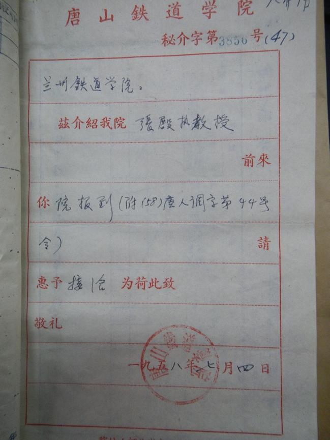张殿执教授由唐山铁道学院调至兰州铁道学院工作的调令
