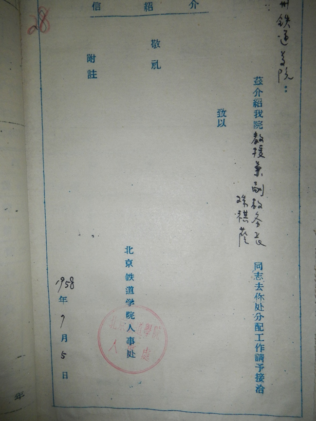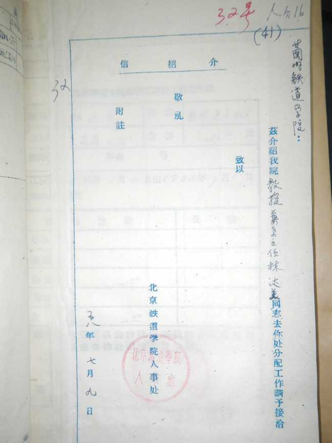孙祺荫教授由北京铁道学院人事处出具的分配工作介绍信